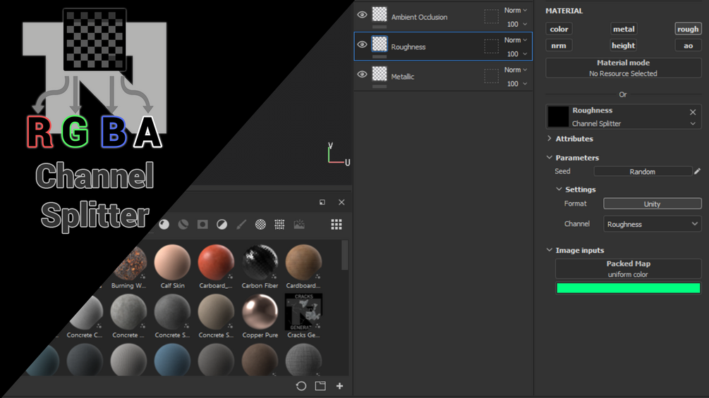 This splitter makes importing packed maps a lot easier. It takes a linear RGBA map as an input and processes based on texture format (currently supported: Unity (R=Metallic, G=Ambient Occlusion, B=Detail Mask/Height, A=Gloss) & Unreal (R=Ambient Occlusion, G=Roughness, B=Metallic, A=Empty/Height). Gloss from Unity is automatically converted to correct roughness in Substance Painter. From there you can easily assign the split maps to their corresponding channels.